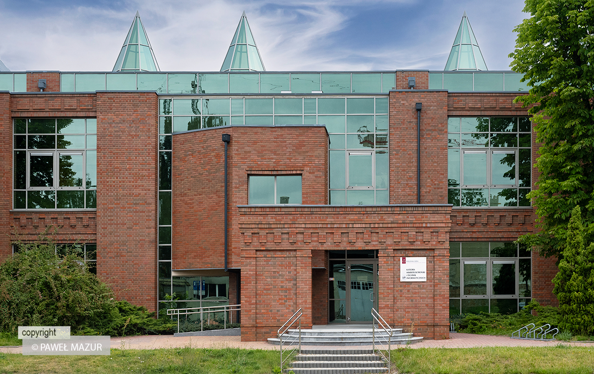 The building of the Lodz University of Technology, constructed in the 1960s as the so-called Technology Hall on the site of the former Schweikert Factory, was rebuilt in the postmodernist style in 2006–2008 according to a design by a team led by Danuta Włodarska (ARTE). As a result of the modernisation, the building received a brick façade, a trapezoidal bay window, a protruding portal, reflective glazing characteristic of Polish postmodernism in the upper part of the façade, and eight tall conical skylights on the roof. Address: 221 Wólczańska Street, Łódź.