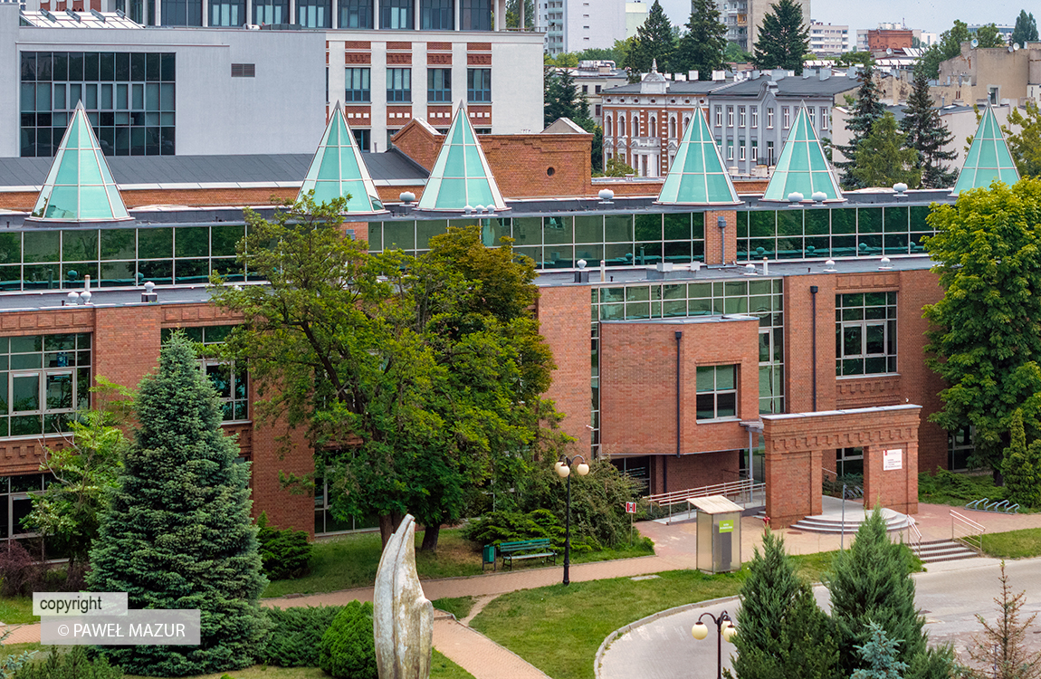 The building of the Lodz University of Technology, constructed in the 1960s as the so-called Technology Hall on the site of the former Schweikert Factory, was rebuilt in the postmodernist style in 2006–2008 according to a design by a team led by Danuta Włodarska (ARTE). As a result of the modernisation, the building received a brick façade, a trapezoidal bay window, a protruding portal, reflective glazing characteristic of Polish postmodernism in the upper part of the façade, and eight tall conical skylights on the roof. Address: 221 Wólczańska Street, Łódź.