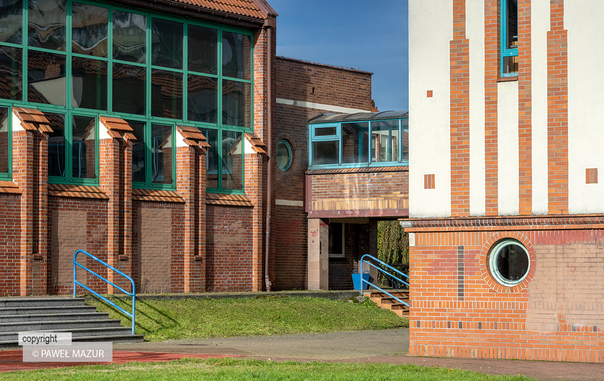 Kompleks szkolny w Giszowcu został wybudowany w latach 1990-2002 według konkursowego, zwycięskiego projektu Stanisława Niemczyka oraz Anny Pieńkowskiej-Kuszewskiej i Marka Kuszewskiego. Inwestycja była realizowana etapami, z których pierwszy został ukończony już w 1993 roku oddaniem części zespołu dla klas młodszych. Obecnie w szkole uczy się ok. 1000 uczniów, którzy korzystają z powierzchni użytkowej prawie 2 tysięcy metrów, w tym sal gimnastycznych, kilku boisk sportowych, basenu, kilku patio i dziedzińca z podcieniami oraz kolumnadą obrośniętą bluszczem. Całość przypomina niewielkie miasteczko (część sal to samodzielne domki) i jest nazywana „szkołą marzeń”. Kompleks zrealizowany w stylu postmodernistycznym, jest określany w literaturze jako „antymodernistyczny”, co dość dobrze i prosto wyjaśnia – na stronie internetowej szkoły – opis jej architektury, jako takiej która „nawiązuje do zabytkowej zabudowy, jest duża, rozległa, a jednocześnie przytulna, z zakątkami do zabawy i odpoczynku”. Adres: ul. Przyjazna 7a, Katowice.
