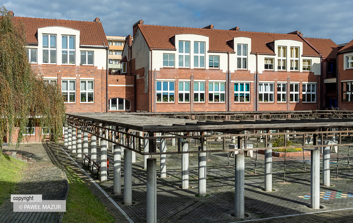 Kompleks szkolny w Giszowcu został wybudowany w latach 1990-2002 według konkursowego, zwycięskiego projektu Stanisława Niemczyka oraz Anny Pieńkowskiej-Kuszewskiej i Marka Kuszewskiego. Inwestycja była realizowana etapami, z których pierwszy został ukończony już w 1993 roku oddaniem części zespołu dla klas młodszych. Obecnie w szkole uczy się ok. 1000 uczniów, którzy korzystają z powierzchni użytkowej prawie 2 tysięcy metrów, w tym sal gimnastycznych, kilku boisk sportowych, basenu, kilku patio i dziedzińca z podcieniami oraz kolumnadą obrośniętą bluszczem. Całość przypomina niewielkie miasteczko (część sal to samodzielne domki) i jest nazywana „szkołą marzeń”. Kompleks zrealizowany w stylu postmodernistycznym, jest określany w literaturze jako „antymodernistyczny”, co dość dobrze i prosto wyjaśnia – na stronie internetowej szkoły – opis jej architektury, jako takiej która „nawiązuje do zabytkowej zabudowy, jest duża, rozległa, a jednocześnie przytulna, z zakątkami do zabawy i odpoczynku”. Adres: ul. Przyjazna 7a, Katowice.