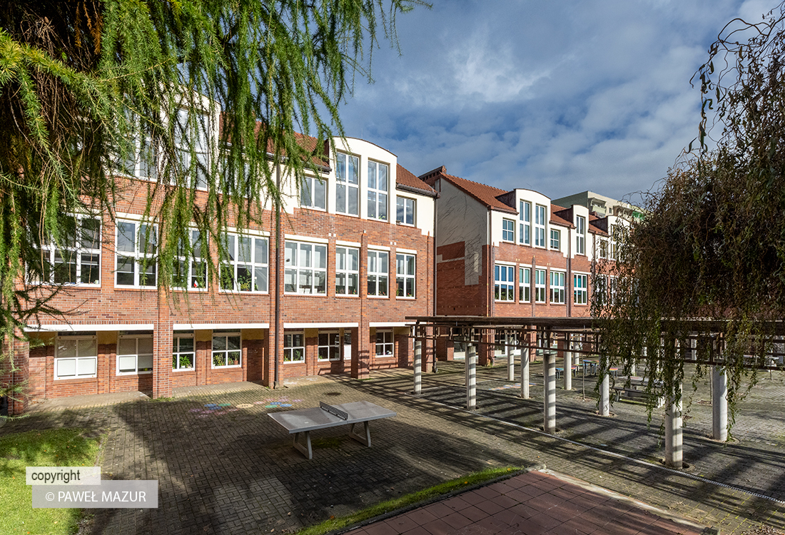 Kompleks szkolny w Giszowcu został wybudowany w latach 1990-2002 według konkursowego, zwycięskiego projektu Stanisława Niemczyka oraz Anny Pieńkowskiej-Kuszewskiej i Marka Kuszewskiego. Inwestycja była realizowana etapami, z których pierwszy został ukończony już w 1993 roku oddaniem części zespołu dla klas młodszych. Obecnie w szkole uczy się ok. 1000 uczniów, którzy korzystają z powierzchni użytkowej prawie 2 tysięcy metrów, w tym sal gimnastycznych, kilku boisk sportowych, basenu, kilku patio i dziedzińca z podcieniami oraz kolumnadą obrośniętą bluszczem. Całość przypomina niewielkie miasteczko (część sal to samodzielne domki) i jest nazywana „szkołą marzeń”. Kompleks zrealizowany w stylu postmodernistycznym, jest określany w literaturze jako „antymodernistyczny”, co dość dobrze i prosto wyjaśnia – na stronie internetowej szkoły – opis jej architektury, jako takiej która „nawiązuje do zabytkowej zabudowy, jest duża, rozległa, a jednocześnie przytulna, z zakątkami do zabawy i odpoczynku”. Adres: ul. Przyjazna 7a, Katowice.