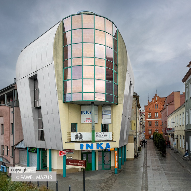 Narożny budynek Handlowej Spółdzielni Inwalidów Inka, wzniesiony w latach 1964-1970, w którym do 1991 roku mieściły się pomieszczenia biurowo-magazynowe, piwiarnia, oraz studencka kawiarnia INKA (Intelektualno-Naukowy Klub Akademicki). W 1999 roku budynek został gruntownie przebudowany i otrzymał bryłę, odwróconej „metalowej gruszki”, która w zamyśle autorów (Katarzyna Boguszewska, Marek i Maciej Powązka) ma „wyraźne zaakcentować narożnik kwartału ulic” i nadać mu „dynamiczny kontrast”. W efekcie powstał siedmiokondygnacyjny Dom Handlowy INKA (w tym piwnica, niski parter i poddasze z tarasem), do dzisiaj wzbudzający w Olsztynie silne kontrowersje. W 2024 spółka Inka wystawiła budynek na sprzedaż za 6,5 miliona złotych. Adres: Feliksa Nowowiejskiego 1, Olsztyn.