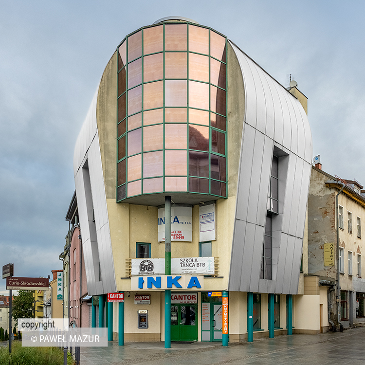 Narożny budynek Handlowej Spółdzielni Inwalidów Inka, wzniesiony w latach 1964-1970, w którym do 1991 roku mieściły się pomieszczenia biurowo-magazynowe, piwiarnia, oraz studencka kawiarnia INKA (Intelektualno-Naukowy Klub Akademicki). W 1999 roku budynek został gruntownie przebudowany i otrzymał bryłę, odwróconej „metalowej gruszki”, która w zamyśle autorów (Katarzyna Boguszewska, Marek i Maciej Powązka) ma „wyraźne zaakcentować narożnik kwartału ulic” i nadać mu „dynamiczny kontrast”. W efekcie powstał siedmiokondygnacyjny Dom Handlowy INKA (w tym piwnica, niski parter i poddasze z tarasem), do dzisiaj wzbudzający w Olsztynie silne kontrowersje. W 2024 spółka Inka wystawiła budynek na sprzedaż za 6,5 miliona złotych. Adres: Feliksa Nowowiejskiego 1, Olsztyn.