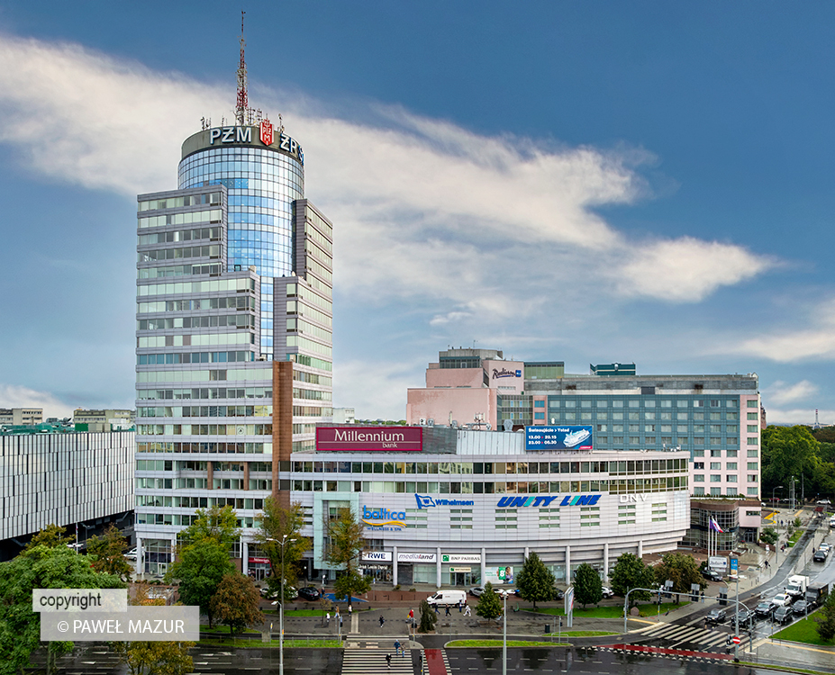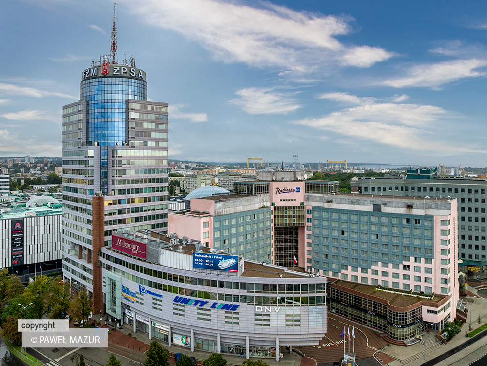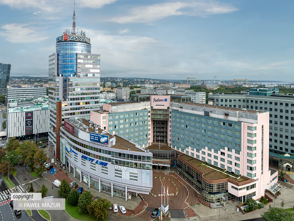 Jeden z pierwszych polskich nowoczesnych kompleksów biurowo-hotelowych transformacji lat 90. Główną dominantą rozległego gmachu jest 92-metrowa szklana wieża, w której mieszczą się m.in biura Polskiej Żeglugi Morskiej. Wschodnią część kompleksu zajmują dwa skrzydła 4-gwiazdkowego Radisson Blu Hotel. Wybudowany w latach 1990-1992 obiekt zaprojektował związany z Polską chorwacki architekt Miljenko Dumenčić. Adres: Pl. Rodła 8, Szczecin.