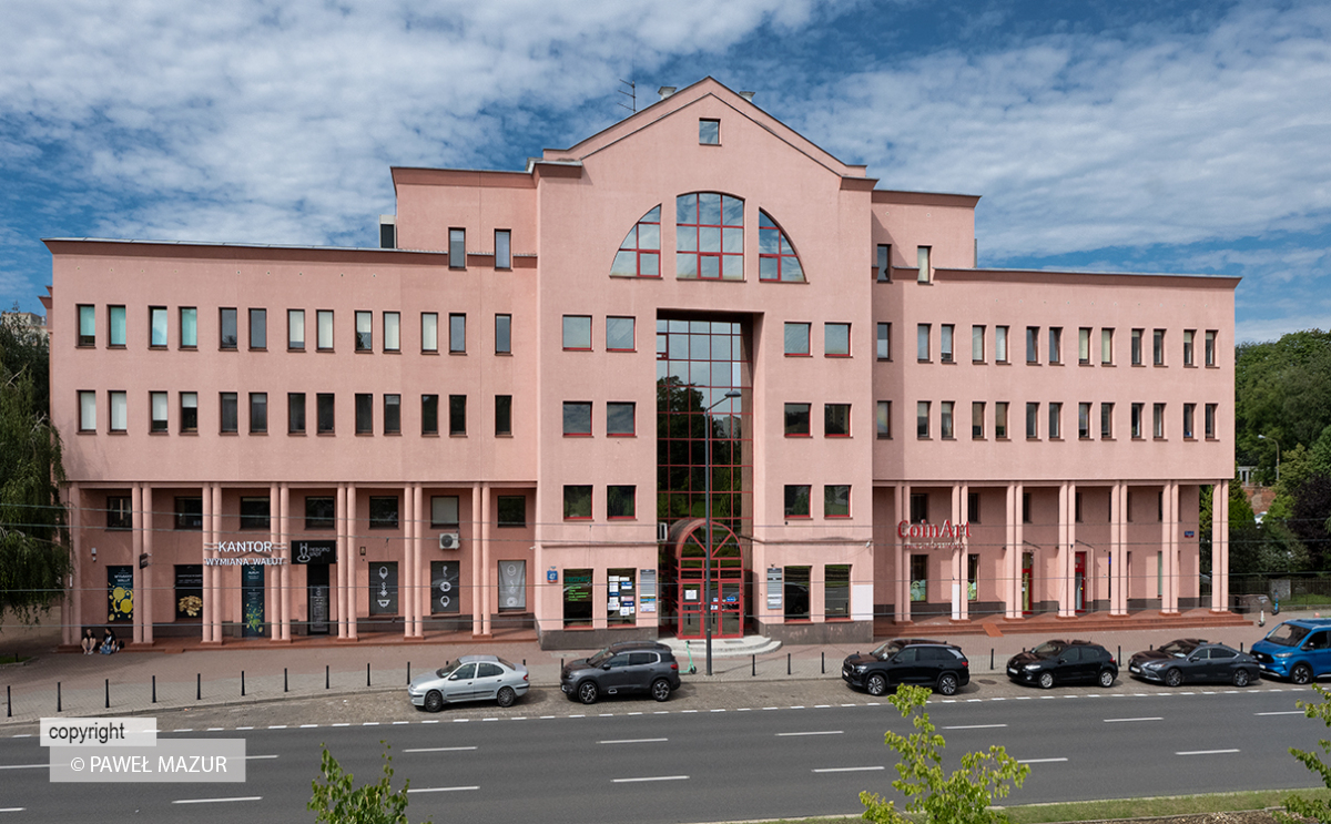 „Najntisy”, czyli lata 90. w pałacowej, stołecznej formie. Różowy, postmodernistyczny budynek biurowy klasy B powstał w latach 1989-1993 według projektu Krzysztofa Chwaliboga, Ryszarda Girtlera i Jerzego Kołomyckiego. Wyposażony w typowe i topowe rozwiązania architektury transformacji: kolumnadę, szkło refleksyjne w metalowej kracie, ryzalit i łuki. Przez lata budynek był siedzibą wielu firm budowlanych i deweloperskich. Mieściły się tu m.in. spółki z grupy J.W. Construction oraz biuro projektowe JW Architecture. Obecnie właścicielem i głównym zarządcą jest spółka REDCO. Adres: ul. Okopowa 47, Warszawa.