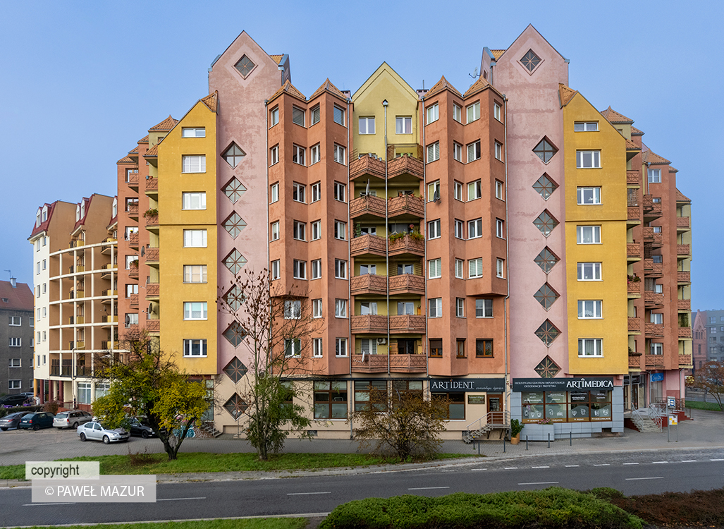 Zespół mieszkaniowy pomiędzy ulicami Wyszyńskiego i Jedności Narodowej we Wrocławiu został wybudowany w 1994 roku. Jego wschodnią część od strony Starej Odry zaprojektował (1993) zespół pod kierownictwem Kazimierza Gruna, z którym współpracowali Aldona Kożan i Henryk Andrzejewski. Budynek zrealizowany na planie litery „u” wyróżniają pionowe linie kolorowych baszt zwieńczonych ostrymi dachami, trójkątne wykusze i cztery wieże pełniące rolę klatek schodowych. Przypominający zamek kompleks, tworzy silną dominantę urbanistyczną w rejonie połączenia ulic Wyszyńskiego i Jedności Narodowej oraz Mostów Warszawskich. Adres: Stefana Wyszyńskiego 144–146, Jedności Narodowej 207–209, Wrocław.